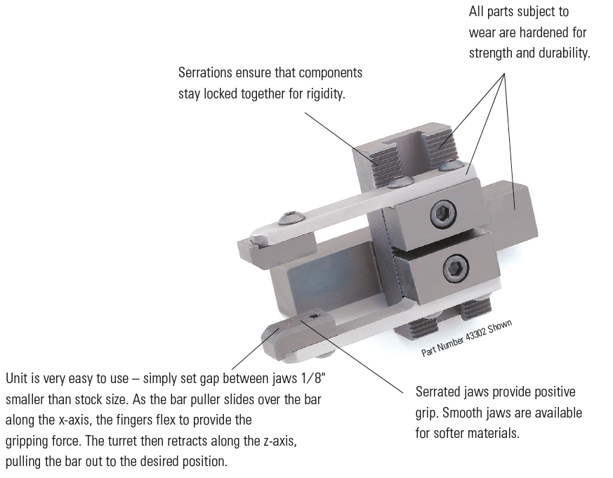 - Each compact bar puller includes one set of serrated jaws and one blank spindle bushing.