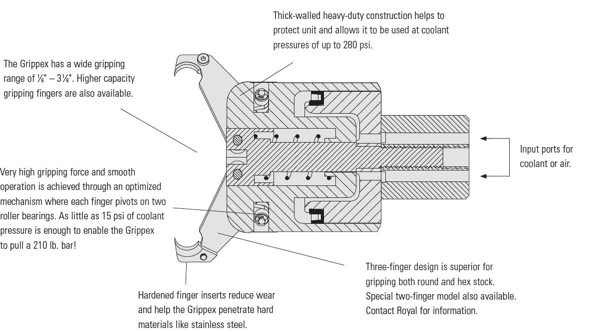 - The Royal Grippex 20L bar puller is actuated by a CNC lathe’s coolant system. As coolant is fed through the unit, it pushes a piston forward which causes the fingers to close around the bar stock. When the coolant is turned off, the fingers automatically spring open.