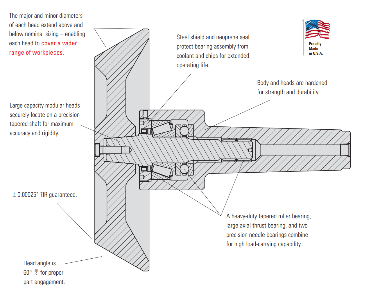 - Bearing configuration consisting of a heavy-duty tapered roller bearing, a large axial thrust bearing, and two precision needle bearings provides exceptional accuracy and rigidity under the most demanding production conditions.