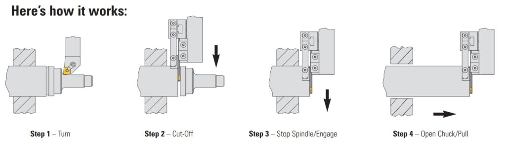 - Reduced cycle time because the turret does not need to index between the cut-off and pulling operations. - Very easy to setup and use.