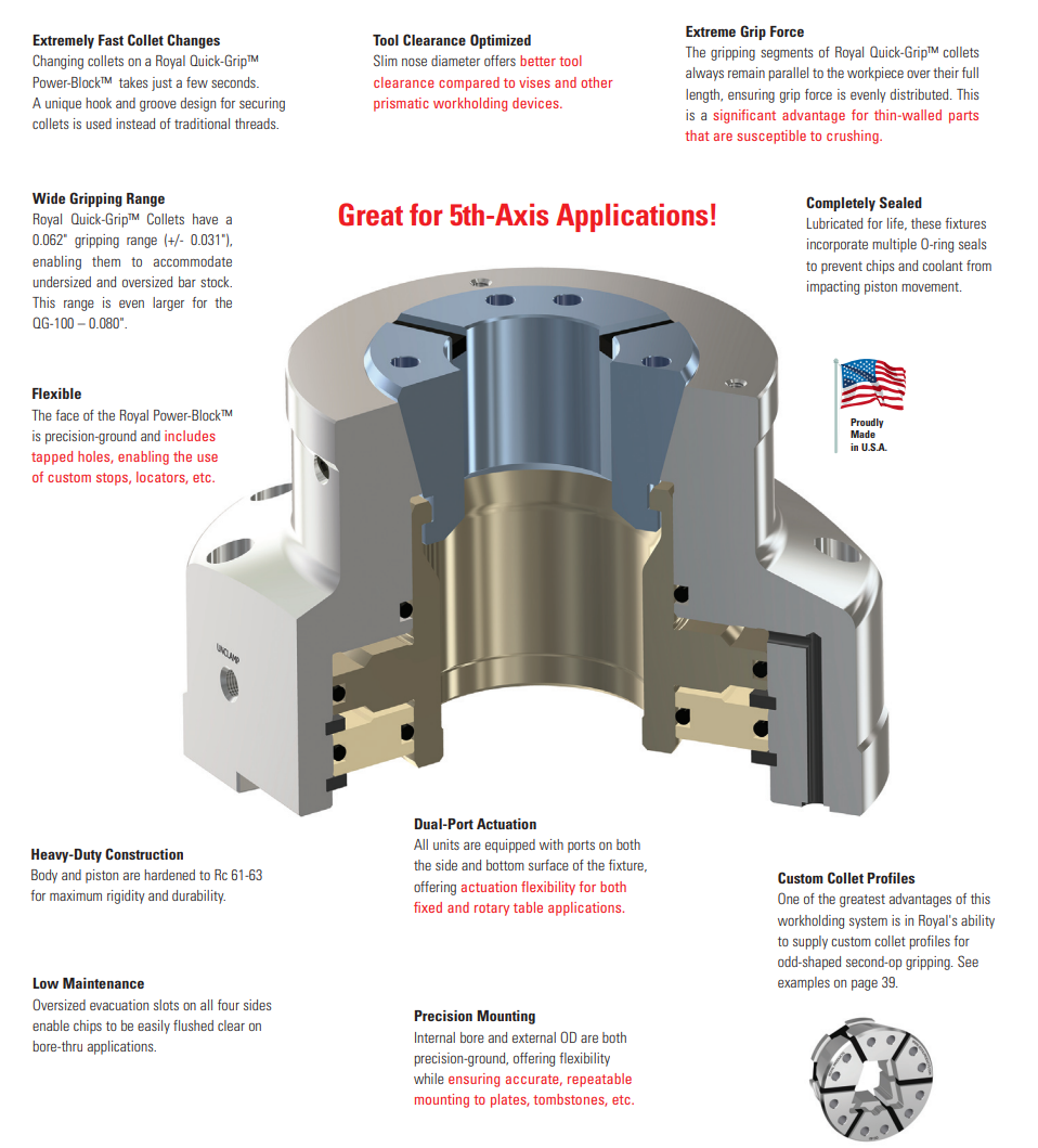 - Royal Power-Block™ Collet Fixtures bring the full functionality of our Quick-Grip™ CNC Collet Chucks to your vertical and horizontal machining centers.
