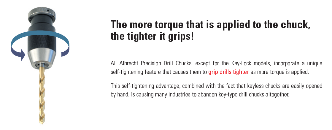 Drill chuck accuracy is critical to producing accurate hole sizing and promoting longer drill life. In today’s competitive environment of short lead times and slim margins, a few scrapped parts can quickly kill a job’s profits. Can you afford to take a chance on anything less than an Albrecht?
